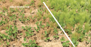 Image description: Top growth control of field horsetail when glyphosate (360 g/L concentration) was applied at 6 L/ac compared to the unsprayed strip (right). Image source: University of Guelph
